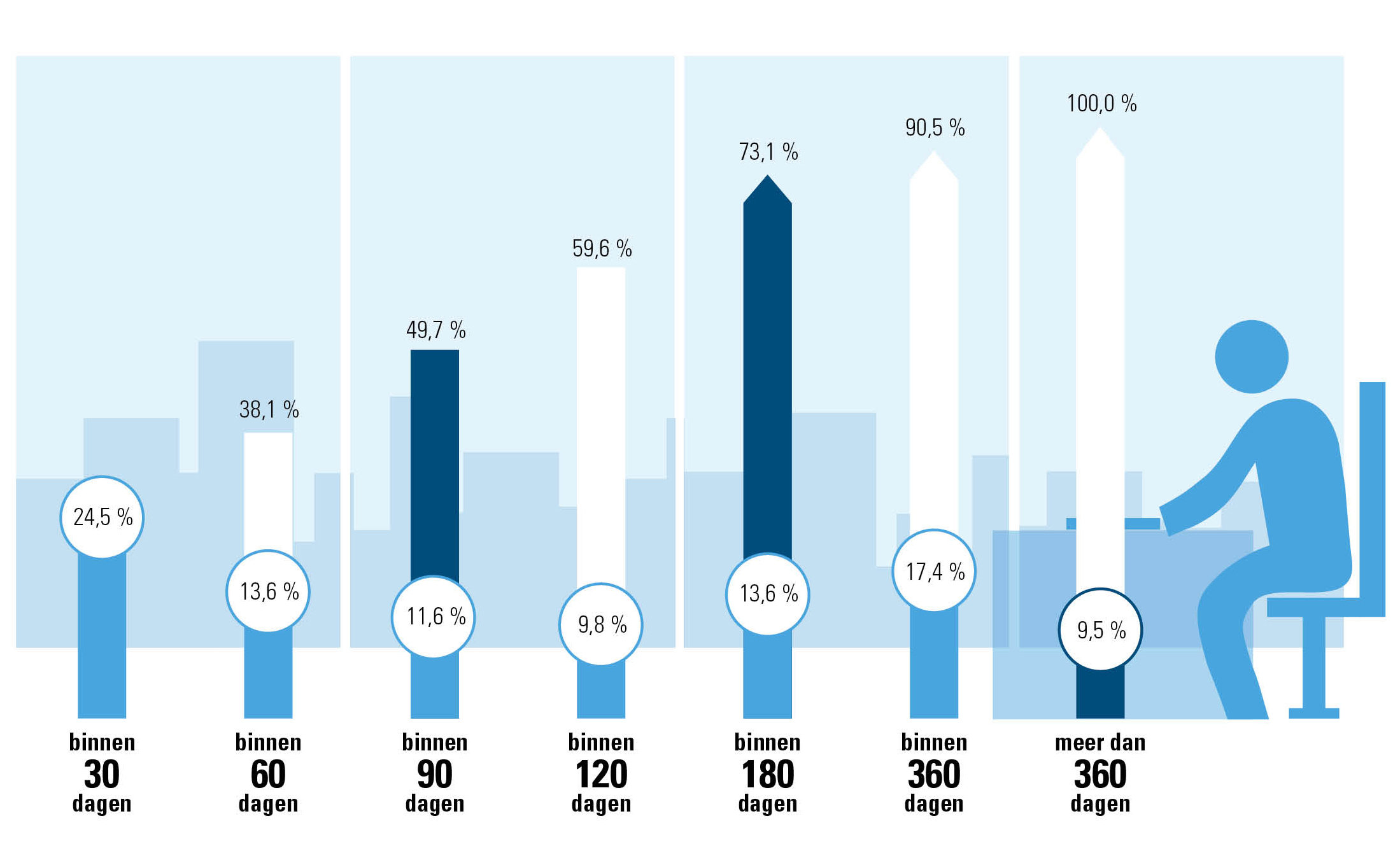 Net niet de helft – 49,71% - van zij die het werk progressief hervatten bij hun werkgever, heeft dat binnen de 90 dagen (3 maanden) gedaan. Kijken we wat het cumulatieve deel is van arbeidsongeschikte werknemers die binnen de 6 maanden het werk progressief heeft hervat, dan komen we uit op een kleine driekwart (73,14%). Maar misschien nog het opvallendste is dat bijna 10% van wie het werk in stappen hervat, daarmee start na meer dan een jaar afwezig te zijn geweest.