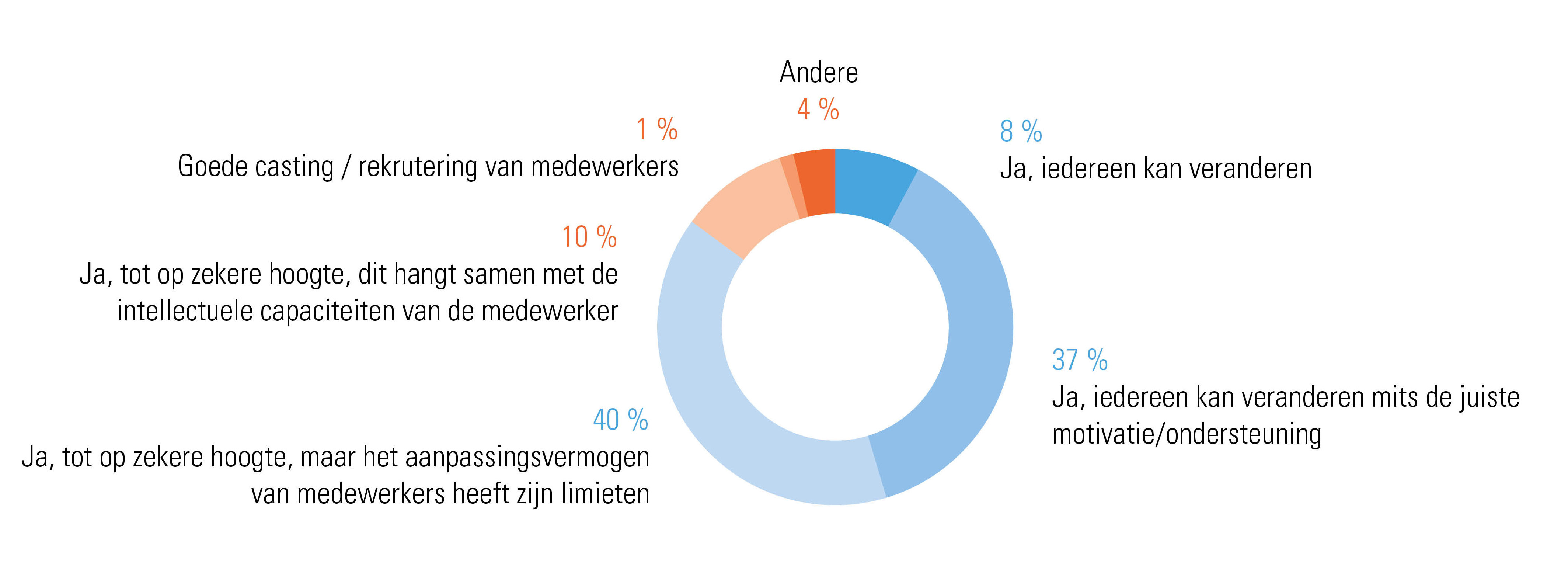 De overgrote meerderheid van werkgevers - 95% - is ervan overtuigd dat hun mensen kunnen veranderen om op lange termijn hun functie binnen het bedrijf te kunnen blijven opnemen. 8% meent dat daar geen voorwaarden aan verbonden zijn. 37% van de werkgevers legt de voorwaarden bij zichzelf: medewerkers moeten goed worden gemotiveerd en gesteund. Het blijft wel een meerderheid die meent dat er aan aanpassingsvermogen ook limieten zijn.