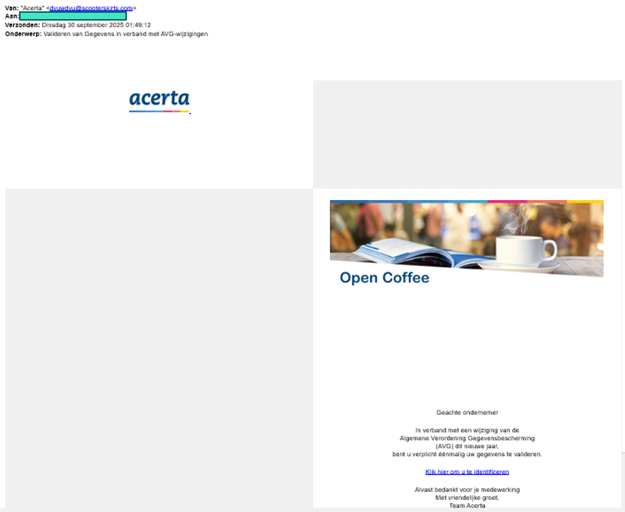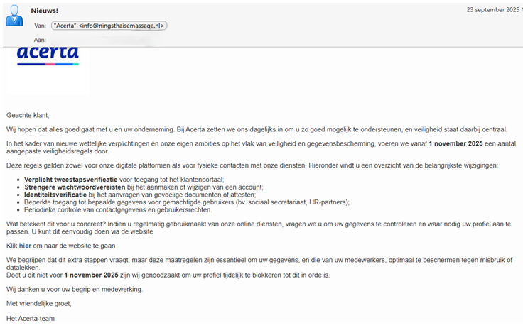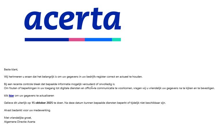 At Acerta, the security of our customers and their data is an ongoing concern. Unfortunately, in this digital world, everyone faces malevolent practices such as phishing. We consciously invest in secure and high-performance systems that monitor these practices but certain threats, such as phishing, arise completely outside our systems, and this is something we also wish to alert you to.