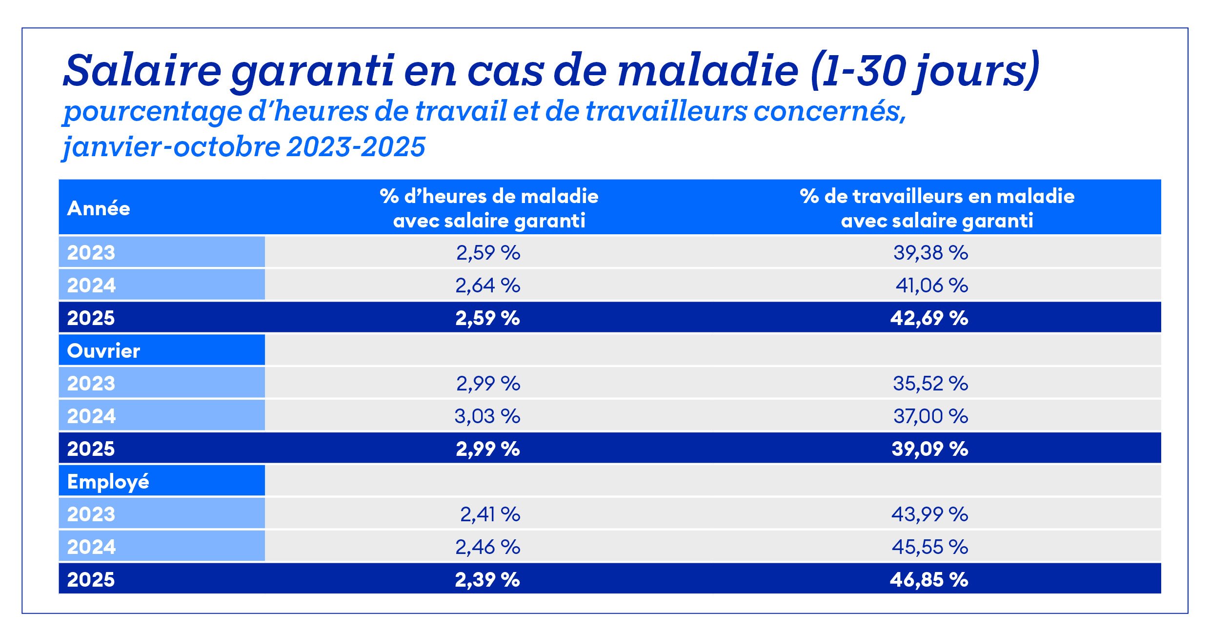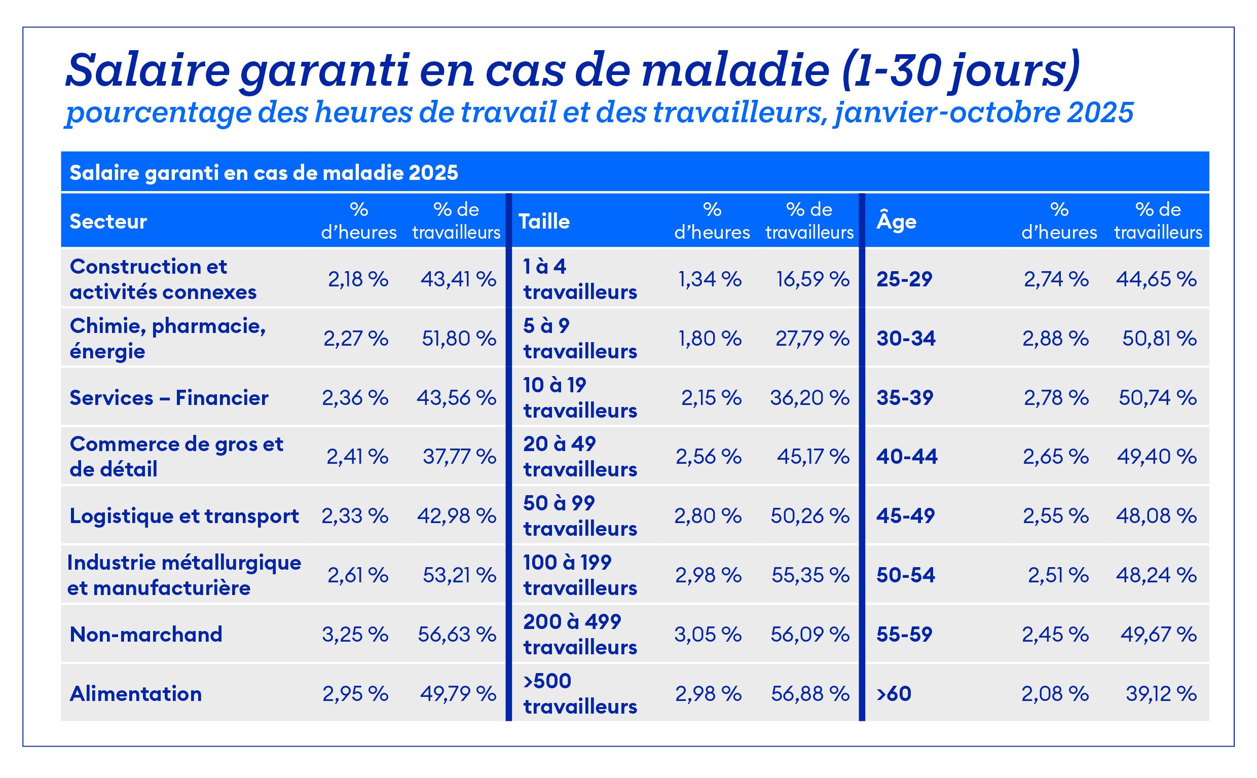 Illustration 3 : Salaire garanti en cas de maladie (1-30 jours), pourcentage d’heures de travail non prestées pour cause de maladie, septembre/octobre 2025 – Chiffres Acerta