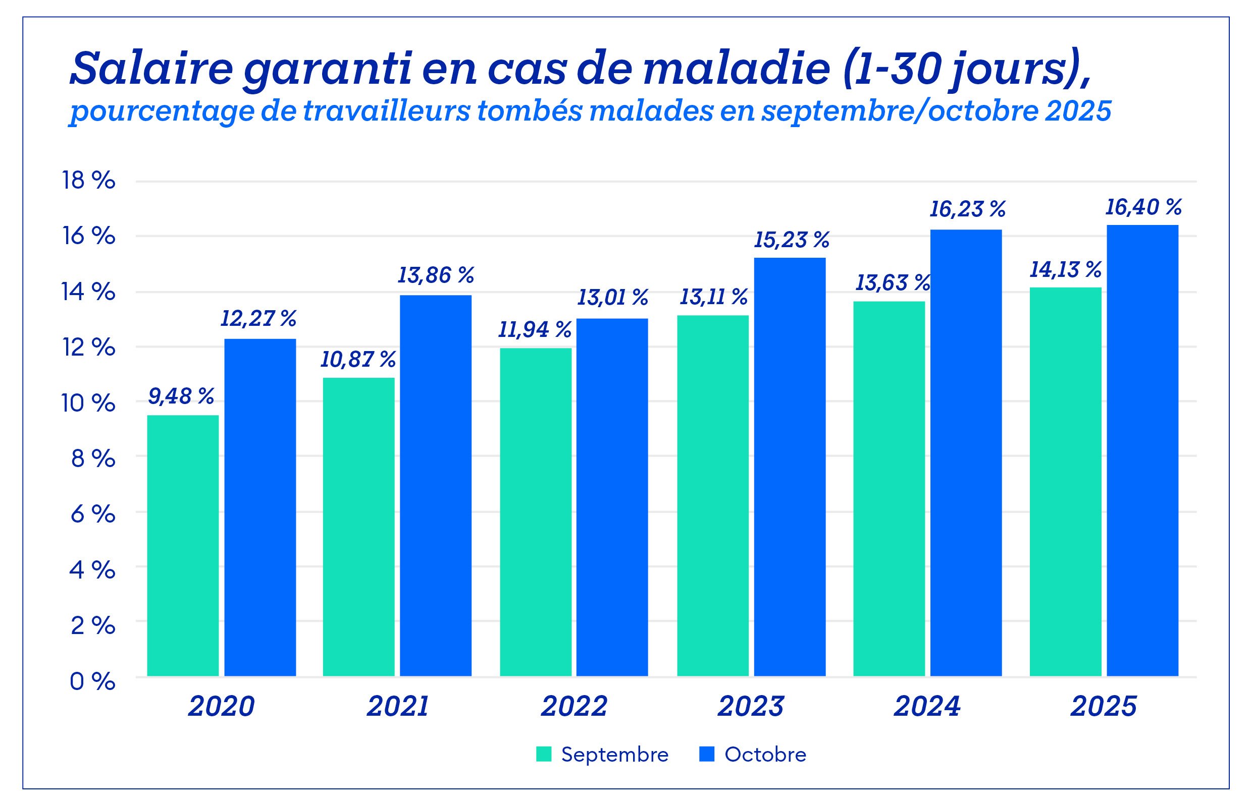 Illustration 2 : Salaire garanti en cas de maladie (1-30 jours), pourcentage de travailleurs tombés malades en septembre/octobre 2025 – Chiffres Acerta