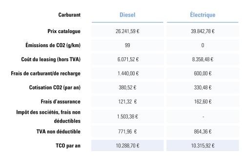 Le CTP inclut le prix d’achat, les taxes, les frais d’assurance, la consommation, les frais de carburant et/ou de charge ainsi que la déductibilité fiscale. Vous avez ainsi une idée claire du coût annuel d’une voiture de société qui vous permet de comparer différents modèles de voitures de société sur une base objective. De plus, le CTP des voitures de société électriques se rapproche de celui des voitures à moteur à combustion. Cela constitue un signe positif pour le verdissement de la mobilité.