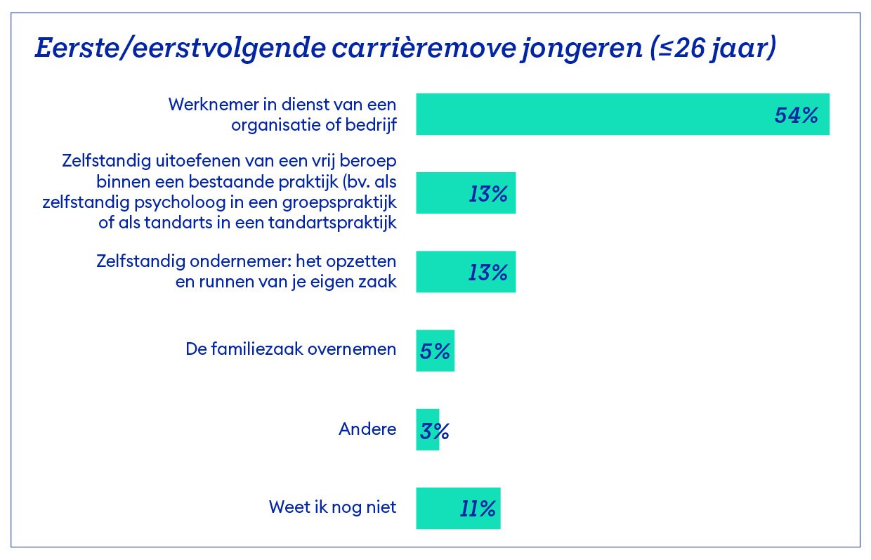 Opvallend is echter dat studenten hun ambitie om zelfstandige te worden als eerste carrièremove niet steeds kunnen waarmaken. Bij studenten en pas afgestudeerden die nog niet werken, ligt de intentie om als zelfstandige te starten namelijk een stuk hoger (resp. 33% en 37%) dan bij de pas afgestudeerde jongeren die al aan het werk zijn. Daarvan is slechts 23% effectief als zelfstandige actief.