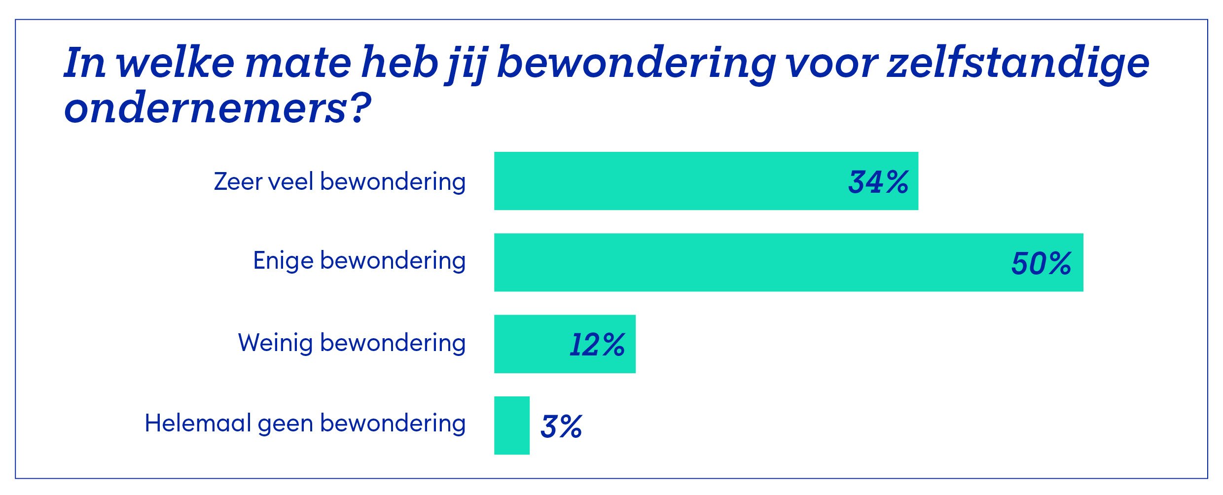 Het zit goed met het imago van ondernemend België bij onze jongeren. Meer dan 8 op de 10 (84%) van de studerende en pas afgestudeerde Belgen heeft bewondering voor zelfstandige ondernemers. 34% heeft zelfs zeer veel bewondering voor onze ondernemers.