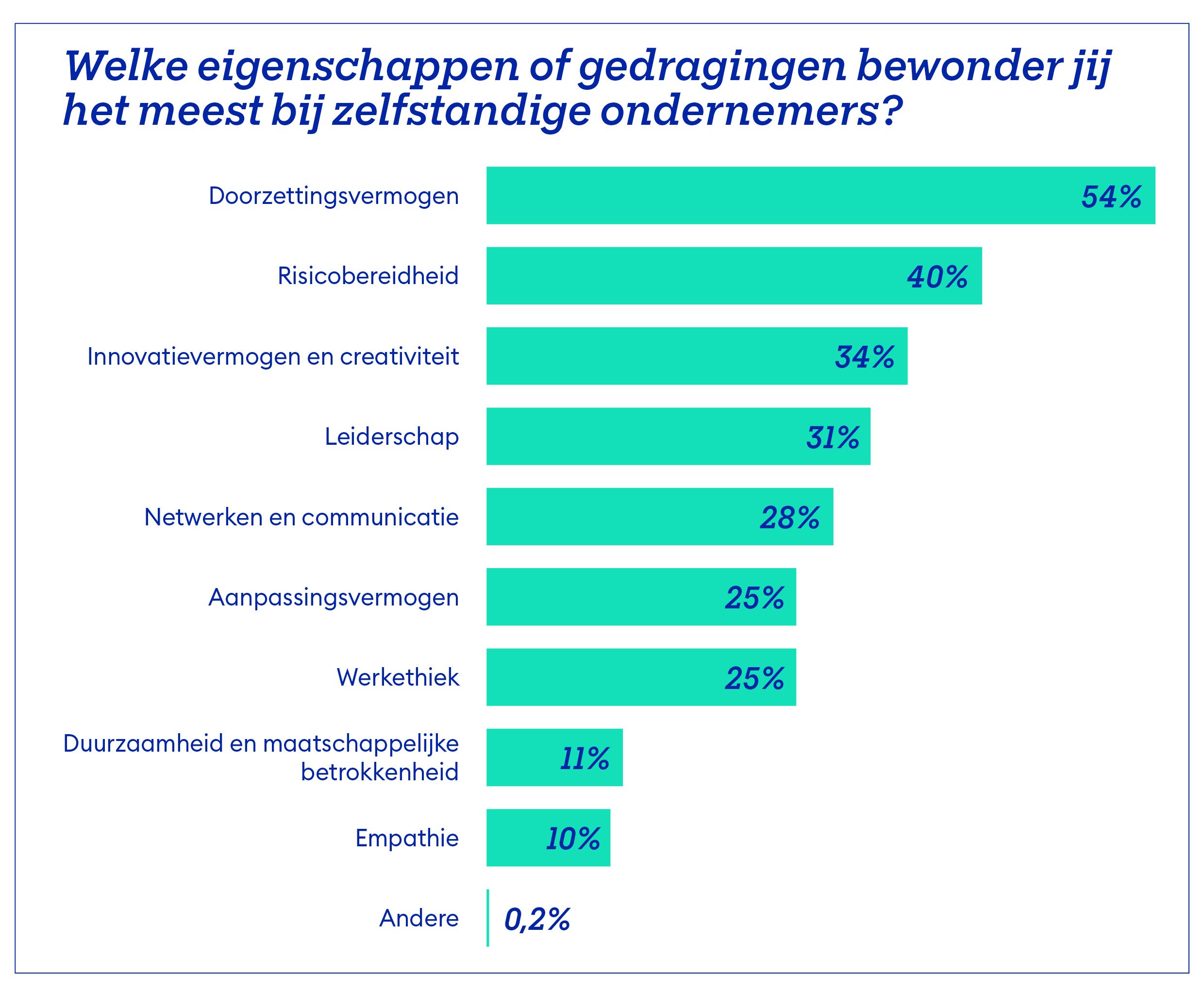 Gen Z’ers zijn vooral onder de indruk van het doorzettingsvermogen en lef van ondernemers. Meer dan de helft (54%) noemt doorzettingsvermogen de meest bewonderenswaardige eigenschap van de zelfstandigen in ons land. Lef of risicobereidheid van ondernemers staat op nummer twee (40%), gevolgd door innovatievermogen en creativiteit (genoemd door 34%).