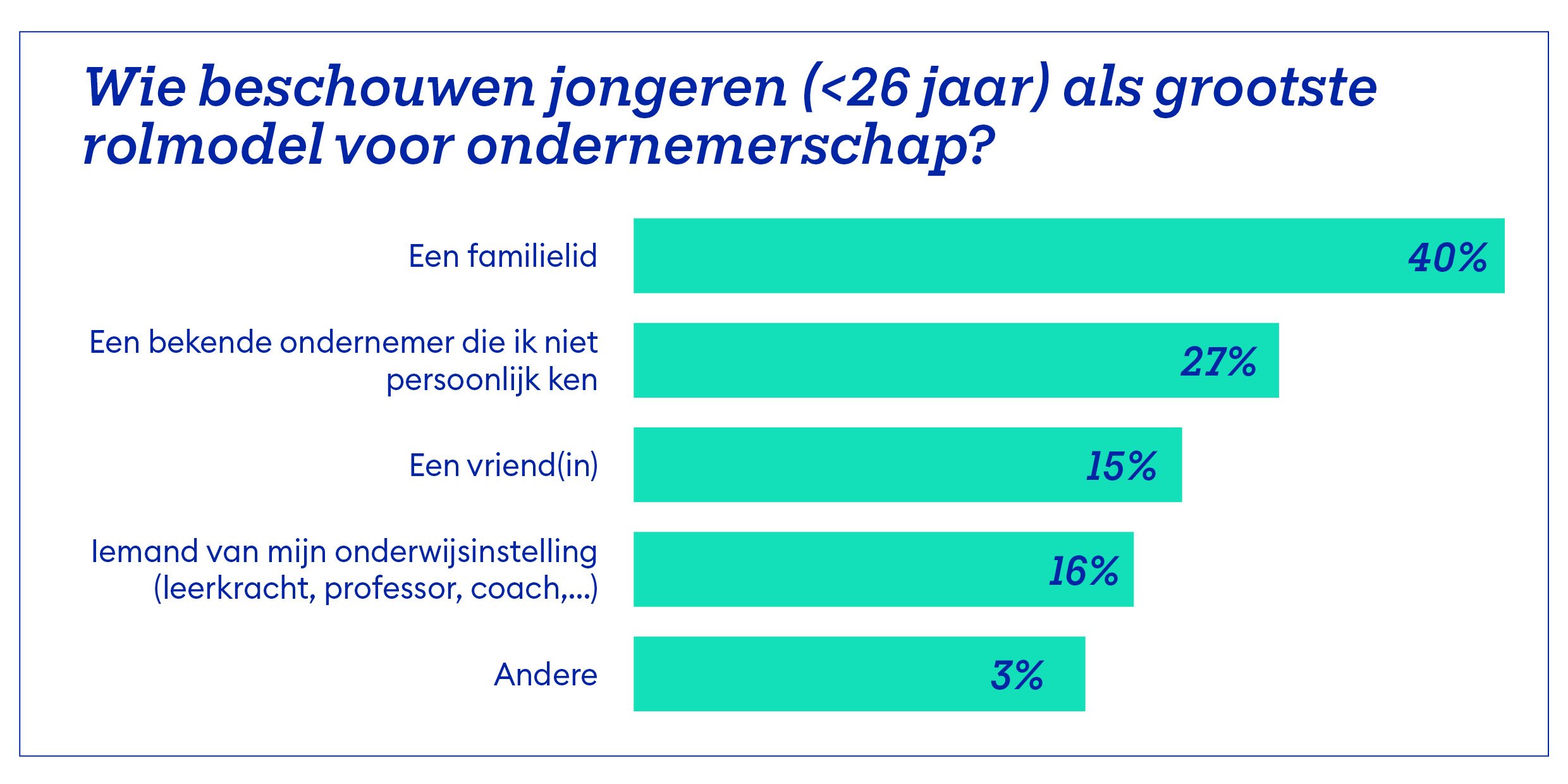 Het zijn niet zozeer de topondernemers, influencers of BV’s – zoals Gert Verhulst of Marc Coucke – die jongeren inspireren, wél de mensen in de nabije omgeving. Maar liefst 71% van de jongeren met een rolmodel denkt aan mensen die ze persoonlijk kennen. Familieleden (40%) staan daarbij op de eerste plaats, gevolgd door personen uit hun opleiding (16%) en vrienden (15%). BV’s – of andere individuen die ze niet persoonlijk kennen – vormen voor iets meer dan 1 op 4 jongeren een inspiratiebron (27%).