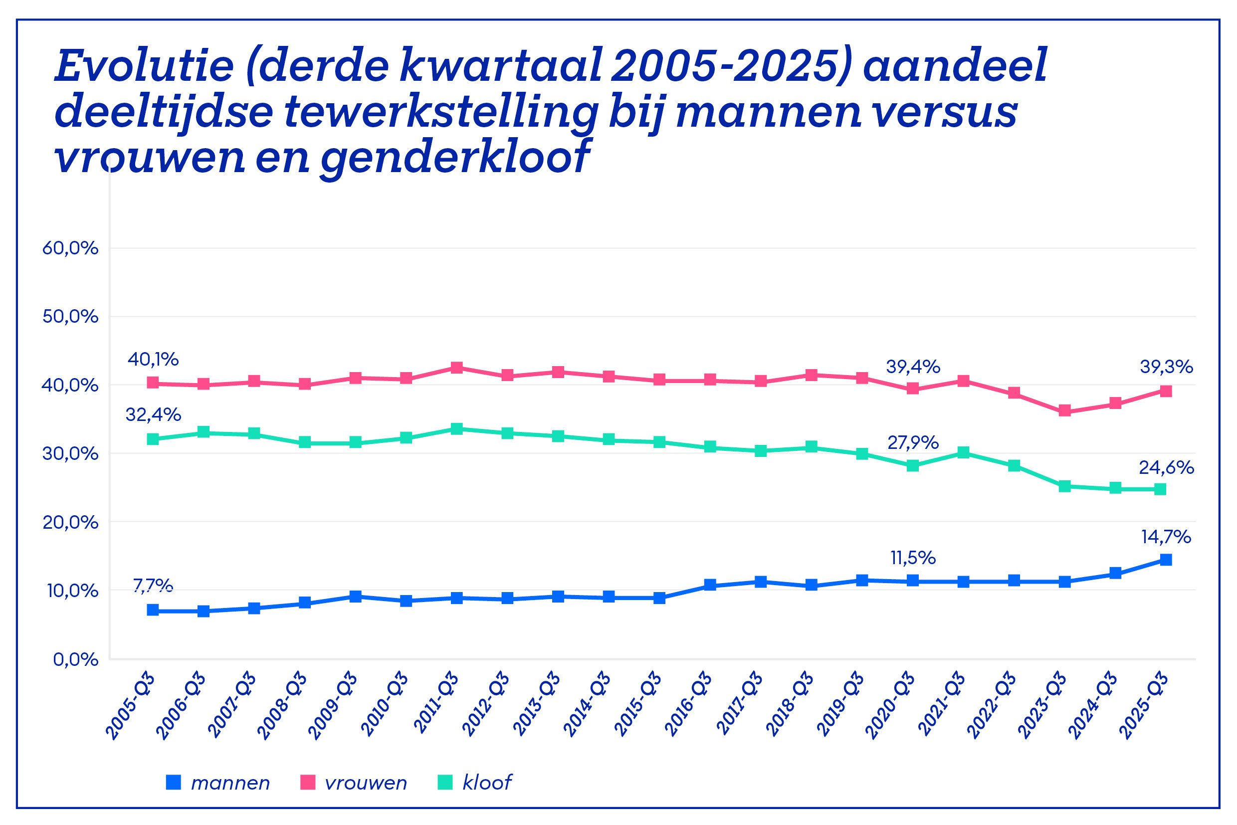 Ook over alle leeftijden heen neemt de genderkloof in deeltijds werk al geruime tijd af in ons land. 20 jaar geleden bedroeg het verschil tussen mannen en vrouwen nog 32,4 procentpunt, in 2020 27,9 procentpunt en in 2025 nog 24,6 procentpunt.