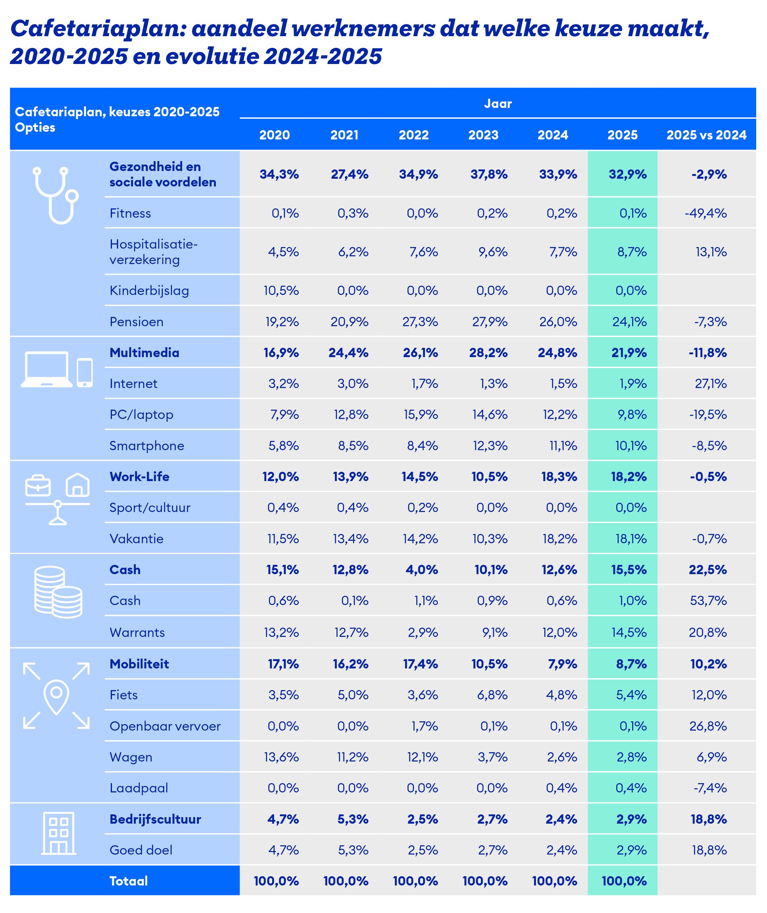 Figuur 1: Cafetariaplan: aandeel werknemers dat welke keuze maakt, 2020-2025 en evolutie 2024-2025