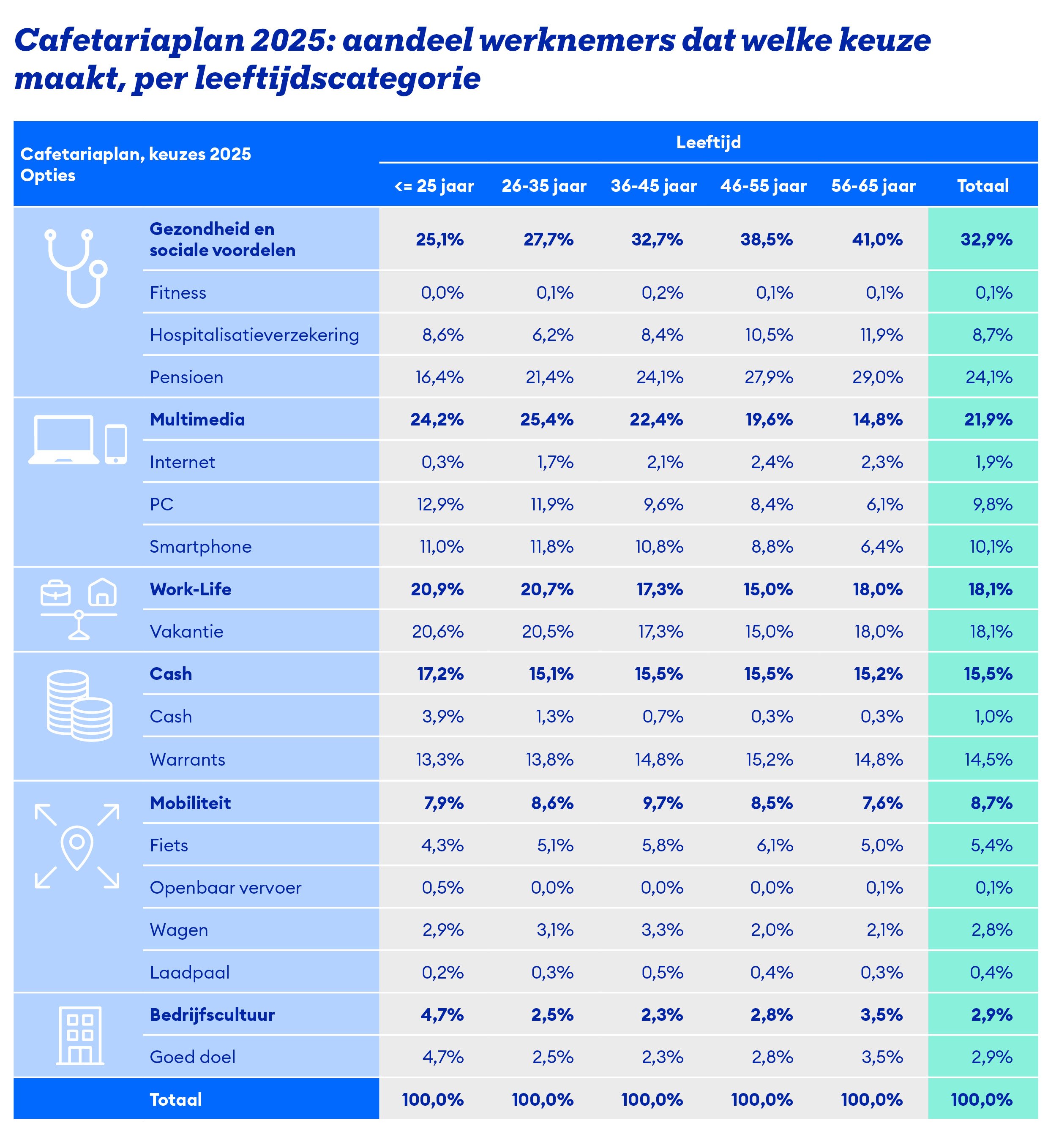 Figuur 2: Cafetariaplan 2025: aandeel werknemers dat welke keuze maakt, per leeftijdscategorie