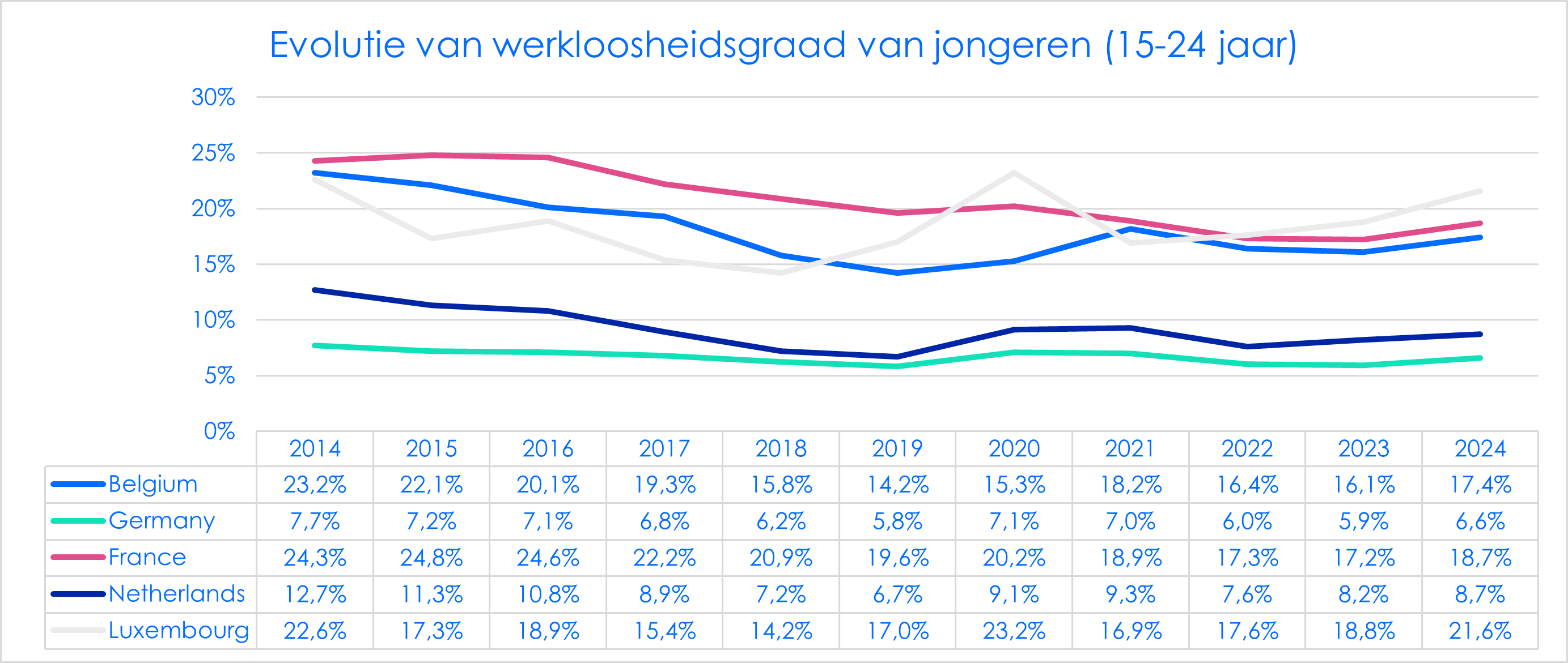 Ook de jeugdwerkloosheid in ons land gaat omhoog. Ze is van 16,1% in 2023 gestegen naar 17,4% in 2024, een toename van 8,1%. Daarmee blijft ons land boven het EU-gemiddelde van 14,9%, al doet het het nog steeds beter dan buurlanden zoals Frankrijk (18,7%) en Luxemburg (21,6%). Duitsland (6,6%) en Nederland (8,7%) blijven veruit de best presterende landen op dit vlak. Opvallend is dat de stijging van de jeugdwerkloosheid zich in vrijwel alle buurlanden voordoet de voorbije jaren.