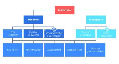 In de privésector zijn er twee grote opties voor loopbaanonderbreking of arbeidsduurvermindering, namelijk tijdskrediet en thematisch verlof. In beide gevallen bestaan er al verschillende klassieke opties: tijdskrediet met motief, tijdskrediet landingsbaan, evenals verschillende thematische verloven. Nu heeft de overheid ook 'corona-opties' voorzien voor specifieke situaties: