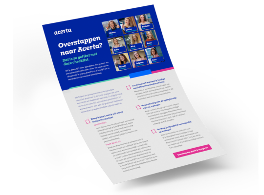 Overweeg je om over te stappen naar Acerta? Met onze handige checklist zie je snel welke vier zaken je moet regelen en hoe je opstart bij Acerta eruitziet. Zo krijg jij vanaf de start al meer tijd om te focussen op de dingen die je graag doet.
